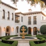 Rustic elegance meets Mediterranean warmth in this beautifully styled Tuscan-inspired exterior. The home’s soft olive green stucco façade is masterfully complemented by terracotta roof tiles, creating an earthy palette that feels both timeless and grounded in natural beauty. Rich wood-framed windows and a medium-stained wooden front door bring warmth and artisanal authenticity to the structure, framed gracefully by arched stone molding that adds depth and softness to the architecture.Flanking the front entryway, two tall, conical evergreen topiaries offer a sculptural anchor and a sense of classical formality, while soft black lantern-style sconces bring ambient lighting and historic charm. The stone pathway underfoot is a standout feature—a mosaic of neutral warm-hued paving stones with deep gray inlay, guiding the eye and creating an elegant invitation into the home.Lush beds of blooming lavender line the walkway in symmetrical rows, offering not only striking color contrast with the home’s olive tones but bathing the entrance in aromatic calm. The landscaping subtly blends form and function, infusing the arrival experience with serenity and design cohesion. The overall mood is refined but unfussy—inviting, grounded, and serenely Mediterranean.