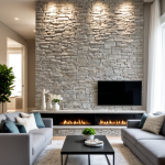 This fireplace vignette captures a refined fusion of farmhouse charm and transitional elegance. The cool gray stone cladding—laid in a textured, staggered pattern—creates gentle visual movement, while the veined marble hearth adds a polished, upscale contrast. Against the muted sage green wall, the white molding of the mantel pops with classic millwork detail and a carved floral motif, grounding the entire scene in sophistication.Anchoring the design is an oversized vintage-style clock, its Roman numerals and distressed face evoking a sense of nostalgia that harmonizes with the traditional candlesticks and scrollwork wall plaques. Symmetry plays a key role in creating balance, with echoing topiary arrangements and flanking candleholders offering a structured softness. The neutral-toned basket with a folded plaid throw adds warmth and tactility—an inviting nod to comfort that tempers the more formal architectural lines.The oversized lantern, with its delicately cut metalwork, introduces an antique flourish, while the cluster of pillar candles inside the firebox speaks to ambiance over function. Altogether, this fireplace design blends function and feeling, perfect for creating a welcoming focal point grounded in quiet charm and sentimental detail.